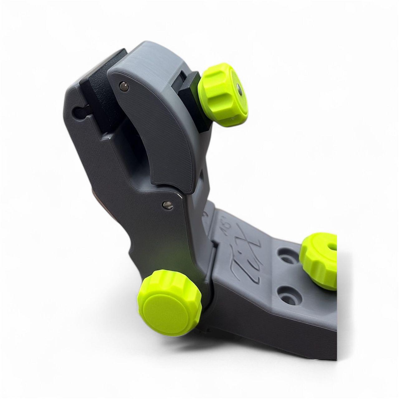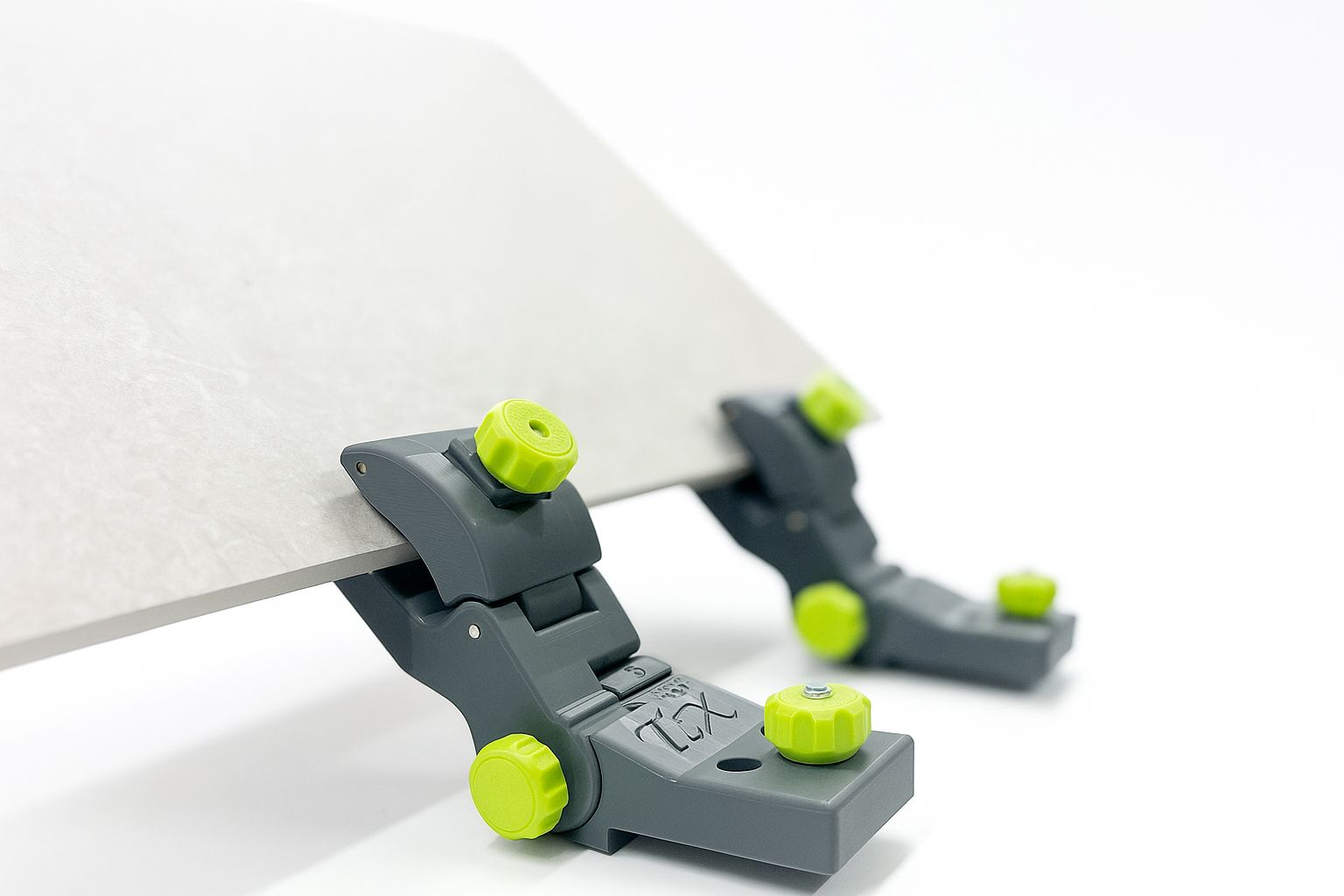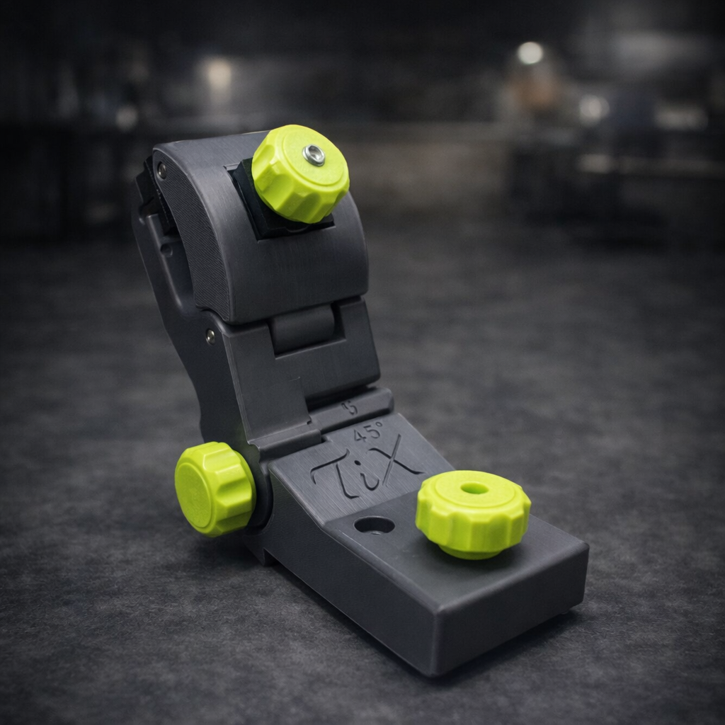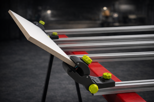 Kaldenurka saab reguleerida vastavalt töö vajadusele, et tagada optimaalne tööasend ja täpne servatöötlus. Klambrite vahele lisatud kummist kontaktpinnad parandavad haardumist ja kaitsevad plaadi pinda kriimustuste eest. Vajadusel saab klambrid kinnitada ka otse lauale kruvide abil.
